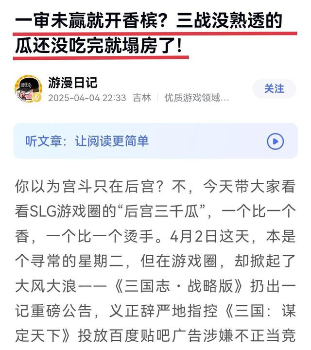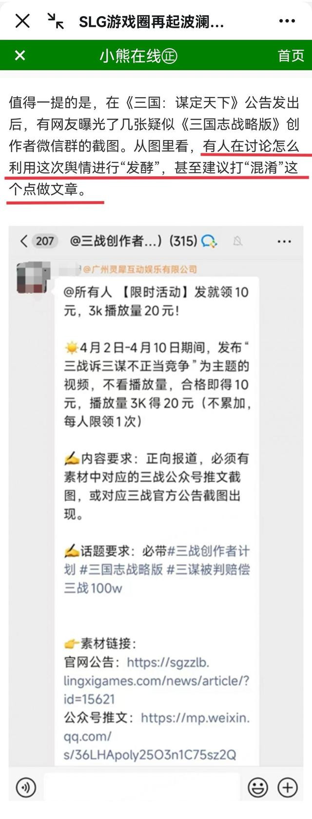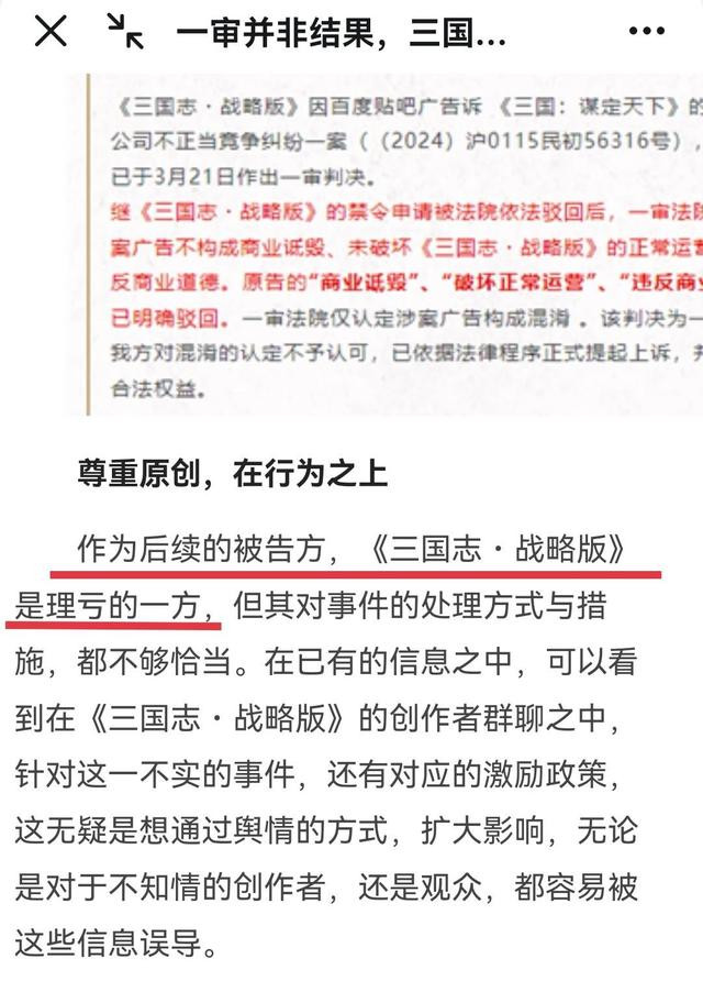 其实要说起来,三谋这波被告还真的不冤。毕竟打广告都打到人家地盘上去了,这不就明着抢人吗?而且用的广告语还是什么“原班人马倾力打造”“升级版 更懂你”这种,一看就容易让人误会,我吃瓜的时候就在某个评论区看到有玩家说,当时看了还真以为是三战续作之类的,结果点进去之后才发现被坑了。 在三战发出公告之后,三谋也有点坐不住了,马上拿出一套“丝滑小连招”。 先是有样学样地发了一篇公告,来给自己“澄清”,不过全文只字不提法院判定的不正当竞争的事实,只片面强调法院驳回的部分,不得不说三谋这一手偷换概念是真的玩得6呀。 接着我还发现更神奇的事,网络上突然出现各式各样力挺三谋的文章,乍一看好像赢官司的是三谋一样。