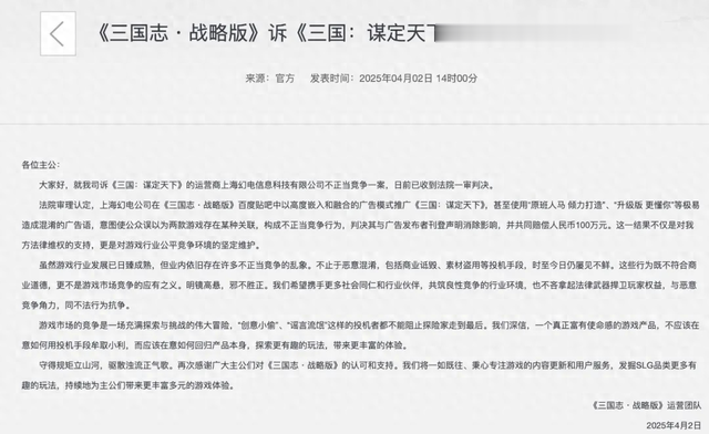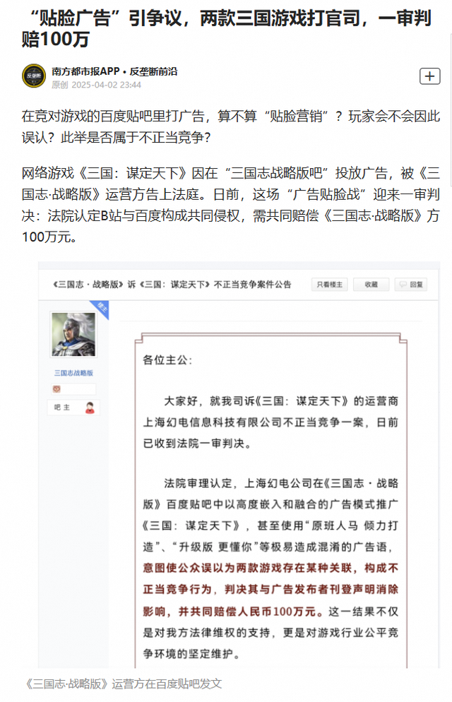 | 最近的游戏圈可谓是非常热闹了。上周,《三国志·战略版》和《三国:谋定天下》又“打起来”了,不知道大伙儿都听说没? 起因是三谋去年在三战贴吧投广告,接着就被三战告上法庭了。现在这案子终于迎来了一审判决,说是法院认定B站与百度构成共同侵权,要共同赔偿灵犀100万。 上周三战官方也是发了个公告,大概意思呢就是告知一下一审判决的结果,同时希望社会和行业都能够一起来营造和维护良好的竞争环境。